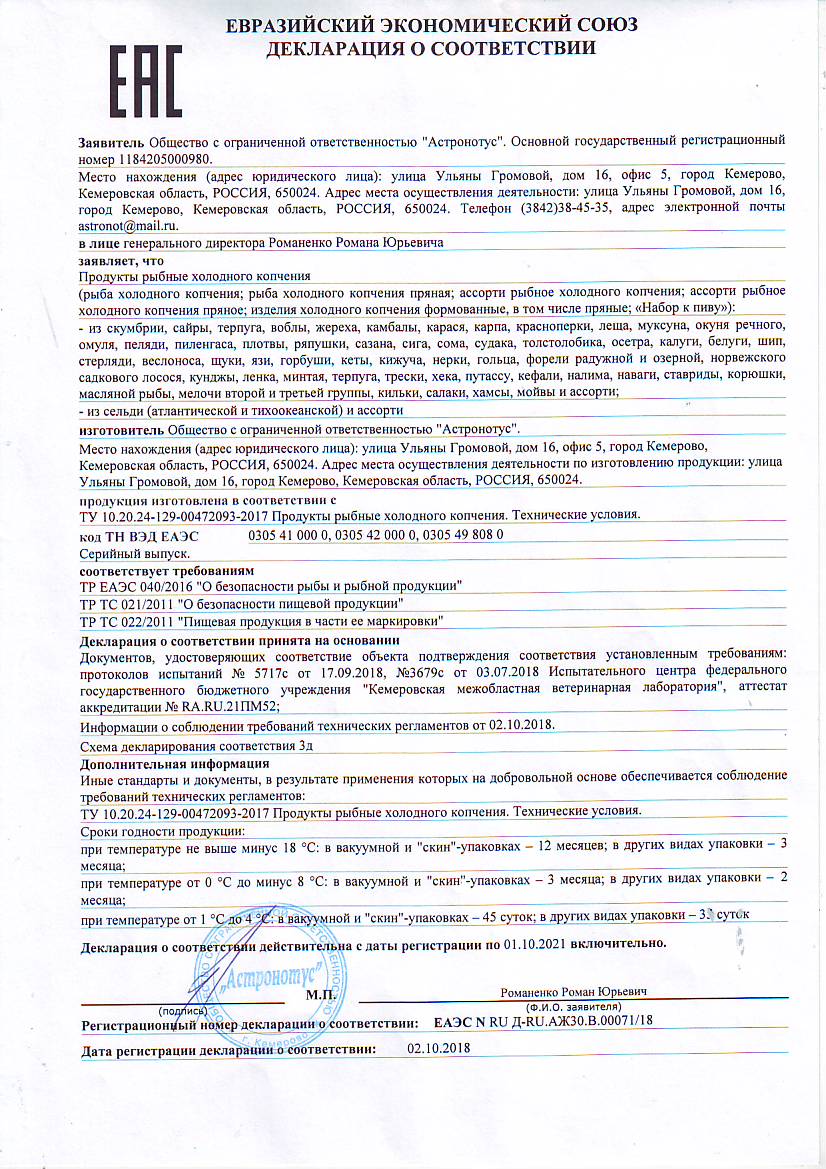 Реализуемая продукция сертифицирована, качество подтверждается наличием деклараций соответствия по каждой группе (рыба холодного копчения, горячего копчения, рыбные масла и пресервы, рыба вяленая, пряного посола, соленая и т.д.) Продукция регулярно подвергается лабораторным исследованиям в соответствии с программой производственного контроля.