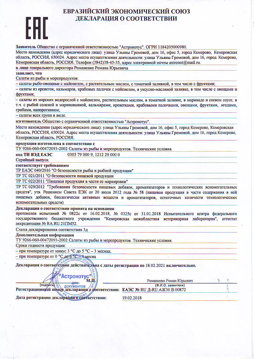 В сети магазинов океан реализуется широкий ассортимент рыбопродуктов. Вся готовая продукция выпускается компанией ООО «Астронотус», которая занимается рыбопереработкой уже 25 лет.