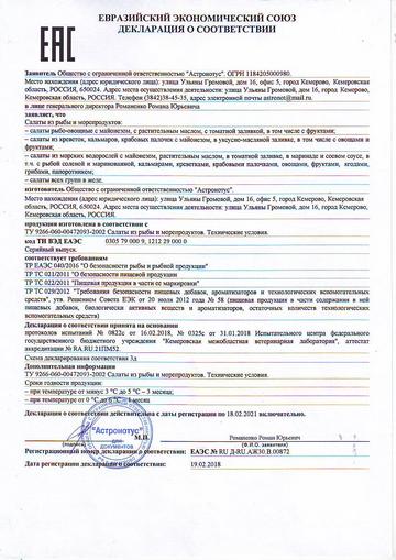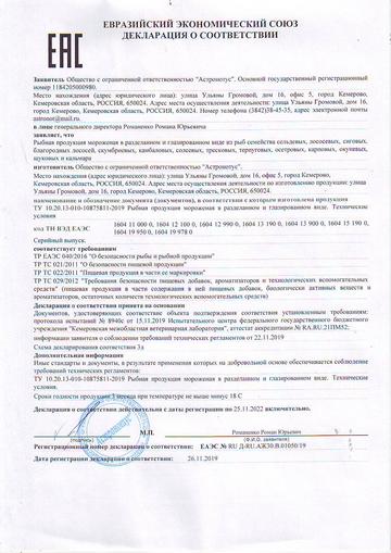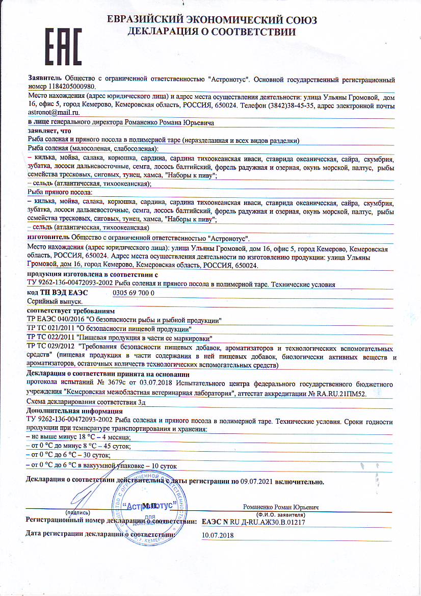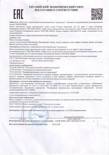 Реализуемая продукция сертифицирована, качество подтверждается наличием деклараций соответствия по каждой группе (рыба холодного копчения, горячего копчения, рыбные масла и пресервы, рыба вяленая, пряного посола, соленая и т.д.) Продукция регулярно подвергается лабораторным исследованиям в соответствии с программой производственного контроля.