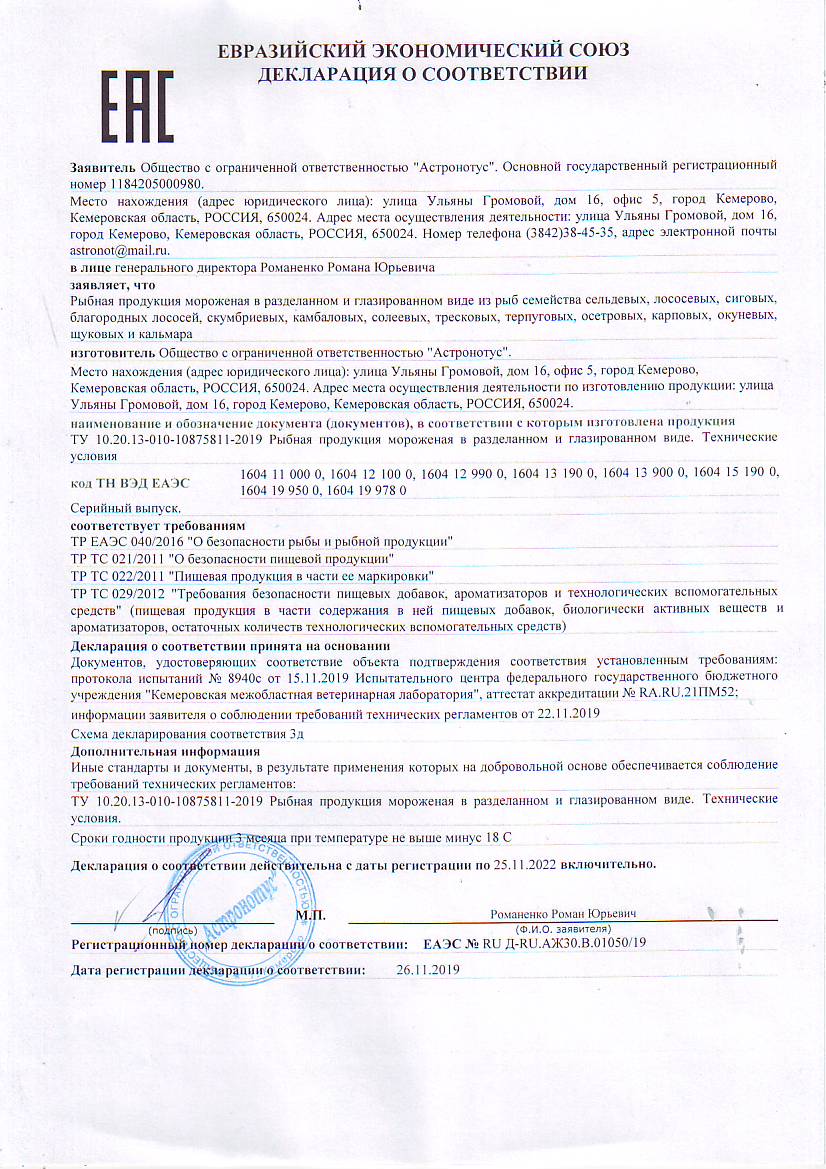 Широкий ассортимент свежемороженой и охлажденной рыбы и морепродуктов, представленный на полках магазинов сопровождается декларациями соответствия.